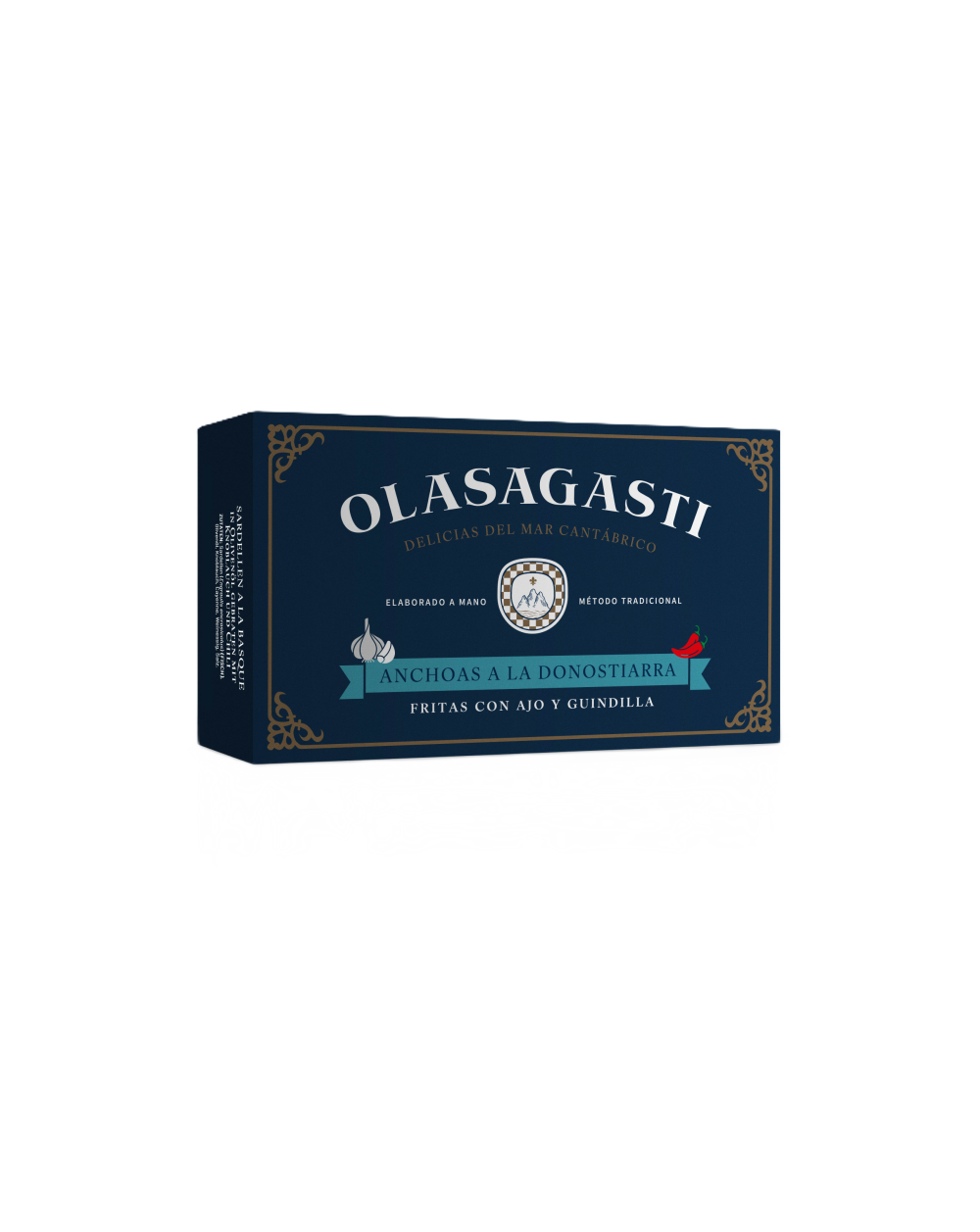 Ingredientes: Anchoas (variedad Engraulis encrasicholus) (53%), aceite de oliva (45%), un diente de ajo entero, una cayena entera, vinagre de vino, sal.